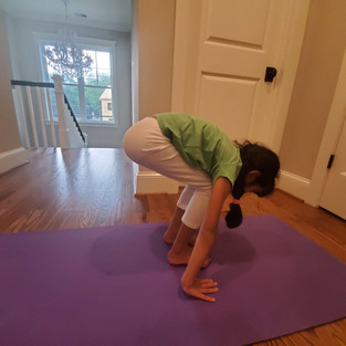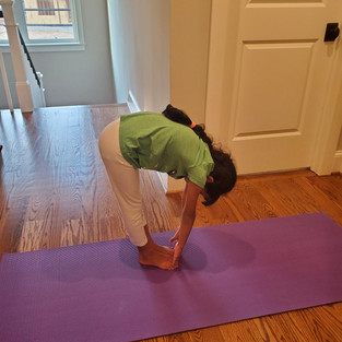 Bend over, touching knees, calves, toes, or floor depending on flexibility. Remember, yoga isn't a competition--stretch as far as you are satisfied with, and only push deeper when you are ready.